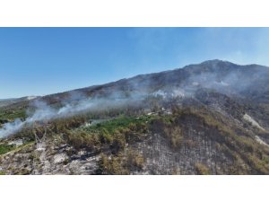 Rüzgarın etkisini yitirmesiyle kontrol altına alınmaya başlanan yangın dron ile görüntülendi.