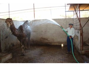 Konuyla ilgili bilgi veren deve kafilesinin sahibi Sait Öztürk, "Mart ayından sonra güreşler tamamlanıyor. Devler bu süre içinde beslenmeye geçiyor. Tüylerini atıyorlar. Havaların da çok ısınması ile birlikte haftanın bir iki günü serinletiyoruz. Yıkıyoruz. Çünkü malum havalar 40 derece. Nemle birlikte 45-50 dereceyi buluyor. Hayvanların da serinlemeye ihtiyacı var. İyi bakılması lazım. Altlarının çok temiz olması lazım. Eylüle kadar böyle yapacağız. Eylülden sonra tüyleri yeniden çıktıktan sonra bu işlemleri yapmayacağız" dedi.