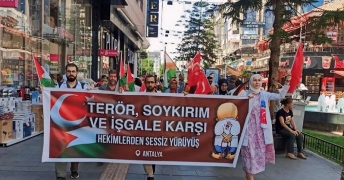 İsrail'in 7 Ekim'den bu yana Filistin ve Gazze'ye yönelik saldırıları devam ederken bugüne kadar 38 binden fazla kişi hayatını kaybederken, 100 binden fazla sivil ise yaralandı. Antalya'da çeşitli hastanelerde görev yapan hekim ve sağlık çalışanlarının oluşturduğu Sessiz Hekimler Platformu yaklaşık 9 aydır ayrım yapmadan devam eden saldırıları düzenledikleri "Sessiz Yürüyüş" ile protesto etti. Muratpaşa Camii'nden başlayan ve Kapalıyol'da sona eren yürüyüşte hekim ve sağlık çalışanlarına çevredeki vatandaşlar da destek verdi.
