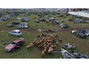 Depremin vurduğu Hatay'da enkazdan çıkarılarak muhafaza altına alınan araçların büyük çoğunluğu hak sahiplerine teslim edildi. Yüzlerce hurda aracın sayıları azalması ile koyunlara otlak olan alanın havadan çekilen görüntüleri ilginç manzaralar oluştu.