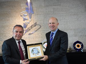 Ziyaret anısına Başkan Muhittin Böcek, İngiltere Ankara Büyükelçisi Sir Dominick Chilcoot’a Konyaaltı’nın özel bir plaketini takdim etti.