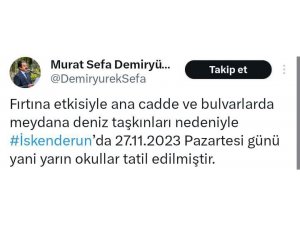 Kuvvetli sağanak yağış ve fırtına sonrası İskenderun Kaymakamı Murat Sefa Demiryürek sosyal medya hesabından yaptığı açıklamada, "Fırtına etkisiyle ana cadde ve bulvarlarda meydana gelen deniz taşkınları nedeniyle İskenderun ilçesinde 27.11.2023 Pazartesi günü okullar 1 gün tatil edildi" ifadelerini kullandı.