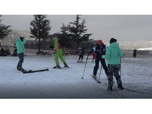 Davraz Kayak Merkezi'nde etkili olan kar yağışı özellikle zirvede kendini gösterirken, kayak merkezinin alt kısmında yeterli yağış olmaması nedeniyle ziyaretçiler suni karlama alanlarında aktivitelerini sürdürdü.
