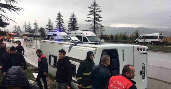 Isparta'da yağışlı havanın etkisiyle işçi servis aracının sürücünün kontrolünden çıkıp devrildiği kazada, 17 kişi yaralandı.