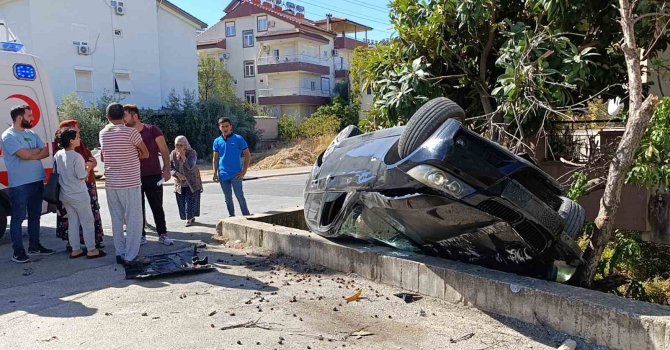 Antalya'da istinat duvarına çarpan otomobil, bahçe duvarında ters dönerek asılı kaldı. O anlar güvenlik kamerasına anbean yansıdı.