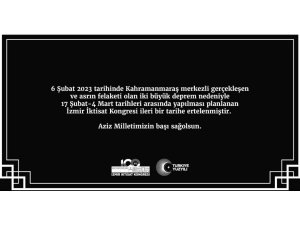 İzmir İktisat Kongresi sosyal medya hesabından yapılan açıklamada, "6 Şubat 2023 tarihinde Kahramanmaraş merkezli gerçekleşen ve asrın felaketi olan iki büyük deprem nedeniyle 17 Şubat-4 Mart tarihleri arasında yapılması planlanan İzmir İktisat Kongresi ileri bir tarihe ertelenmiştir. Aziz milletimizin başı sağ olsun" ifadelerine yer verildi.