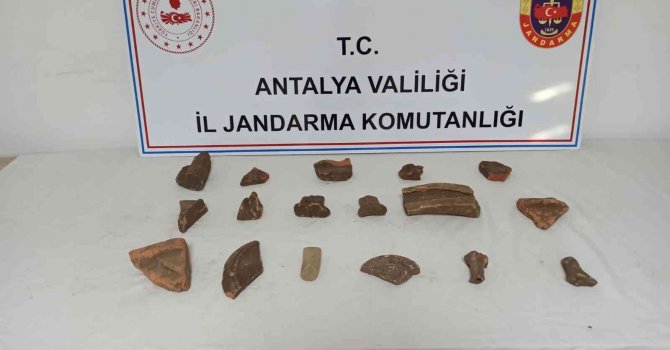 Antalya'nın Aksu ilçesinde 1.derece sit alanında izinsiz kazı yapan 2 kişi gözaltına alınırken, tarihi eser niteliği taşıyan objeler ele geçirildi.