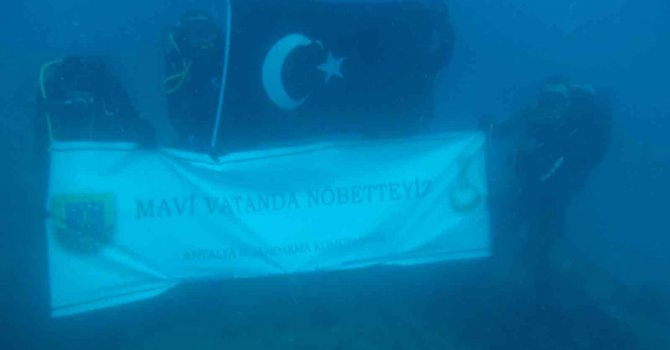 Antalya'da jandarmanın Sualtı Arama Kurtarma Timi, 27 metre derinliğe dalarak "Mavi vatanda nöbetteyiz" pankartı açtı.