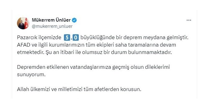 Kahramanmaraş Valisi Mükerrem Ünlüer, meydana gelen 5.0 büyüklüğündeki deprem sonrası AFAD ve ilgili kurumların tüm ekipleri ile saha taramalarına devam ettiği ve şu an itibari ile olumsuz bir durum bulunmadığını açıkladı.