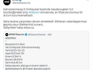Kahramanmaraş merkezli iki büyük depremin yaşanmasının ardından sık tekrarlanan artçı sarsıntılar devam ediyor. Afet ve Acil Durum Yönetimi Başkanlığı (AFAD) yaptığı açıklamaya göre Kahramanmaraş'ın Onikişubat ilçesinde 5.0 büyüklüğünde bir deprem meydana geldi. Saat 05.53'te gerçekleşen deprem yerin 6.95 kilometre derinliğinde meydana geldi. AFAD depremin yaşanmasının ardından resmi sosyal medya hesabından "Kahramanmaraş ili Onikişubat ilçesinde meydana gelen 5,0 büyüklüğündeki artçı deprem sonrasında, an itibarıyla olumsuz bir durum bulunmamaktadır. Saha tarama çalışmaları devam etmektedir. Etkilenen vatandaşlarımıza geçmiş olsun dileklerimizi sunarız. Gelişmeleri takip ediyoruz" şeklinde bir açıklama yaptı.
