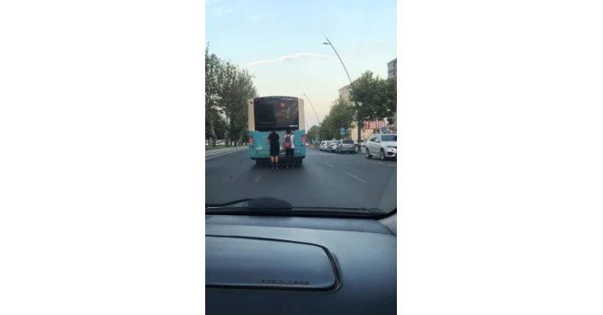 Hayatlarını hiçe sayarak otobüsünün arkasına tutunarak tehlikeli yolculuk yapan çocuklar, otobüsün hızına ve trafikteki tehlikeye aldırmadan dakikalarca bu şekilde gitti.