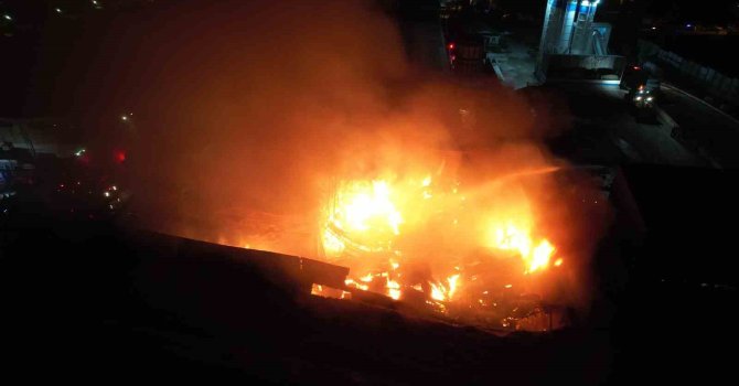Fabrika yangını dron kamerası ile görüntülendi. Geceyi alevlerin aydınlattığı fabrika yangınında ahşap ve kimyasallardan oluşan bölümlerin söndürülmesi için çalışmaların devam ettiği görüldü.