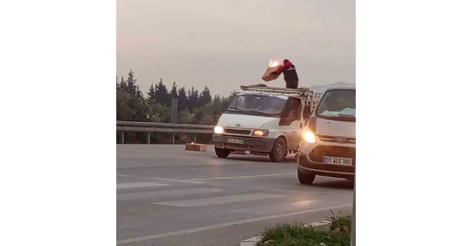 Hatay'da seyir halindeyken kasa kısmındaki eşyaların yandığını fark eden kamyonet sürücüsünün yanan eşyaları boşalttığı anlar kameraya yansıdı.