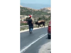 Antakya ilçesi Kuruyer Mahallesi mevkiinde sahiplerinin elinden kaçan boğa, karayoluna çıktı. Bir süre yolun ortasında bekleyen boğa, kendinin peşinde olan 2 kişiyi kovalamaya başladı. Kendini kovalayan kişiye korku dolu bayram yaşayan tosun bir süre sonra karayolundan araziye girerek gözden kayboldu.