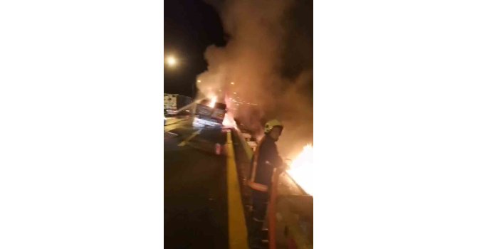 Alınan bilgiye göre, R.B. idaresindeki 42 GM 921 plakalı tır, otoyol Damlama bölgesi Tarsus istikametine ilerlerken karton yüklü dorsesinin lastiklerin bulunduğu noktadan alev aldı. Durumu fark eden sürücü aracı güvenlik şeridinde durdurdu. İhbar üzerine olay yerine intikal eden Mersin Büyükşehir Belediyesi İtfaiye ekipleri müdahale ederek alevleri söndürdü. Olay anında bariyer dışına sıçrayan alevler de kontrol kontrol altına alındı. Yangında maddi hasar meydana geldi.