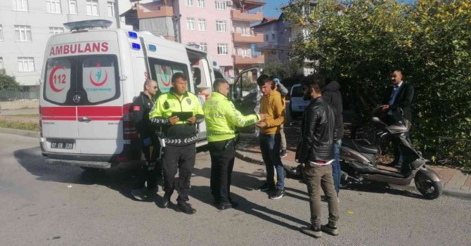 Antalya'nın Manavgat ilçesinde otomobille çarpışan motosiklet sürücüsü, kaskı sayesinde kazayı hafif yaralı atlattı. Motosiklet sürücüsü, telefonla aradığı bir kişiye motosikletini emanet ettikten sonra ambulansa bindi. Kazaya ait görüntüler güvenlik kamerasına yansıdı.