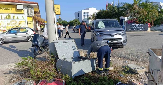 Manavgat'ta kavşak sisteminde hafif ticari araç ile otomobilin çarpışması sonucu meydana gelen kazada kontrolden çıkan araç elektrik panosuna çarparak durabildi.