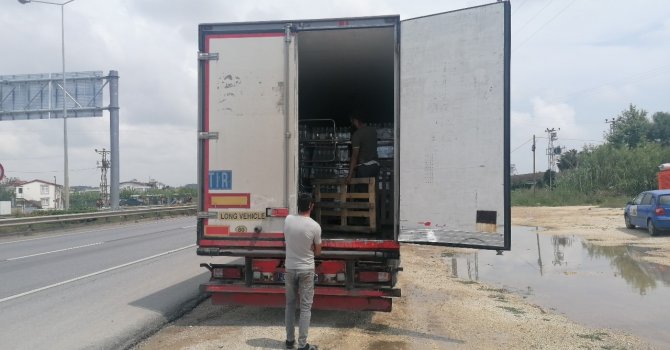 Antalya'nın Manavgat ilçesinde maddi hasarlı kazaya karışan araçlara çarpmamak için ani fren yapan tırın dorsesindeki alkol şişeleri kırıldı. Kazalarda kimsenin burnu dahi kanamazken, tırdaki alkoller yola döküldü.