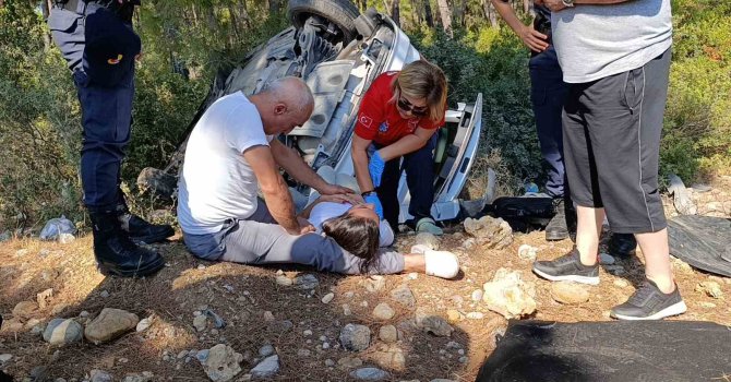 Manavgat'ta virajı almayarak takla atan araçta 3 kişi yaralandı. Kazayı duyarak olay yerine gelen baba, kazada yaralanan kızını kucağına alarak ambulans ve sağlık ekibi gelinceye kadar bir an bile elini bırakmadı.