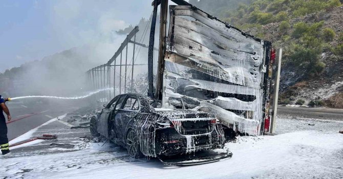Hatay'da kaza sonrası çarpışan otomobil ve tır alevlere teslim oldu.