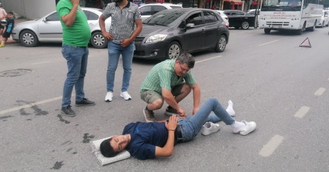 Antalya'nın Manavgat ilçesinde tomobile çarpmamak için fren yapınca devrilen motosikletin sürücüsü yaralandı. Yaralı sürücüye ilk müdahaleyi olay yerinde tesadüfen bulunan bir doktor yaparken, gencin durumunu kontrol eden doktor ambulans gelene kadar başından ayrılmadı.