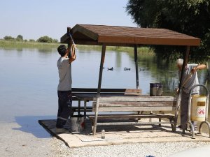 Göl içinde balçık temizliği yapılırken suyun çekildiği alanlara mıcır serildi, kameriyeler boyandı ve uyarı levhaları konuldu.