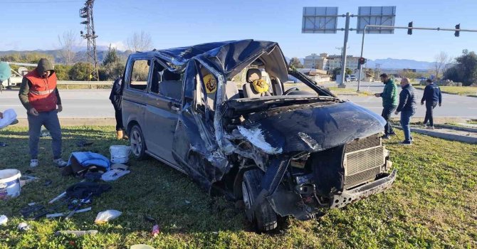 Kaza, Manavgat-Antalya D-400 kara yolu Taşağıl kavşağında meydana geldi. Edinilen bilgiye göre, Antalya istikametinden gelip yeni Antalya-Konya yoluna dönmekte olan Ahmet A.'nın kullandığı 07 YT 069 plakalı hafif ticari araç, Kadir E.'nin kullandığı 42 AGE 887 plakalı minibüse yandan çarptı. Güvenlik kamerasına yansıyan kazada kırmızı ışık ihlali yaptığı belirlenen hafif ticari aracın çarptığı minibüs kavşaktaki refüje devrildi. Kazada hafif ticari aracın sürücüsü Ahmet A. ile minibüste yolcu olarak bulunan Yusuf E., Mikail E., İbrahim E. ve Hakan E. yaralandı. Yaralılar, sağlık ekiplerinin olay yerindeki müdahalesinin ardından ambulansla hastaneye kaldırıldı.