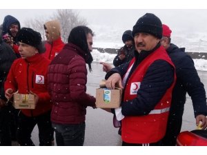 Osmaniye'de Türk Kızılay'ı gönüllüleri, yoğun kar yağışı nedeniyle kapanan Tarsus Adana Gaziantep (TAG) otoyolunda mahsur kalan vatandaşlara kumanya yardımında bulundu.