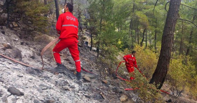 İlk belirlemelere göre yaklaşık 200 dekarlık alanın zarar gördüğü bölgede ekiplerin sarp arazide soğutma çalışmaları devam ediyor.