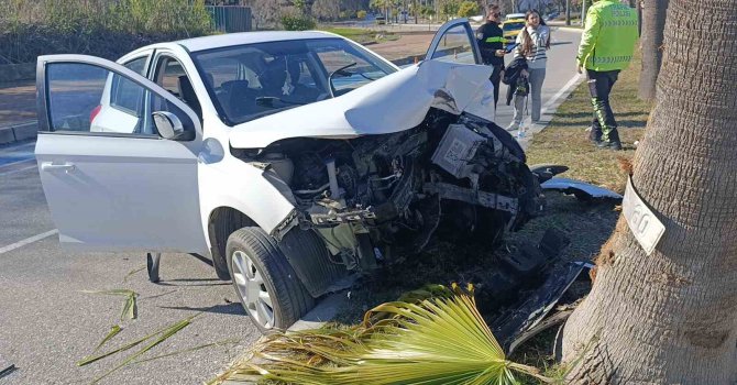 Manavgat'ta sürücüsünün direksiyon hakimiyetini kaybetmesi sonucu palmiyeye çarpan otomobilde bulunan yolcu yaralandı. Çarpmanın şiddetiyle otomobilin plakası çarptığı ağaca yapıştı.