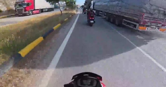 Antalya'da bir tır sürücüsü, aracı trafikte kendisine korna çalan motosiklet sürücülerinin üzerine kırarak, sürücüleri defalarca ölümle burun buruna getirdi. Motosiklet sürücüleri jandarmaya giderek sürücü hakkında şikayetçi oldu.