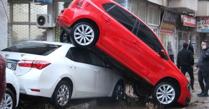 Aracı dik vaziyette başka bir aracın üzerine çıkan Fatih Tozlu, "Aracım park halindeydi. Selden dolayı bu hale geldi. Geceden bu yana uyumadık" şeklinde konuştu.