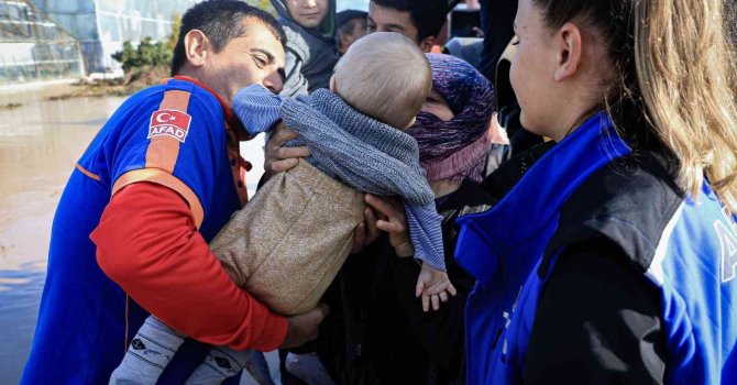 Bir itfaiye aracı yolun çökmesi sonucu suya batarken, evlerinde mahsur kalan aileler küçük çocuklarıyla birlikte kepçe yardımıyla kurtarıldı. Kurtarılan ailede bir bebek ve 3 yaşlarında bir çocuk bulunuyor.