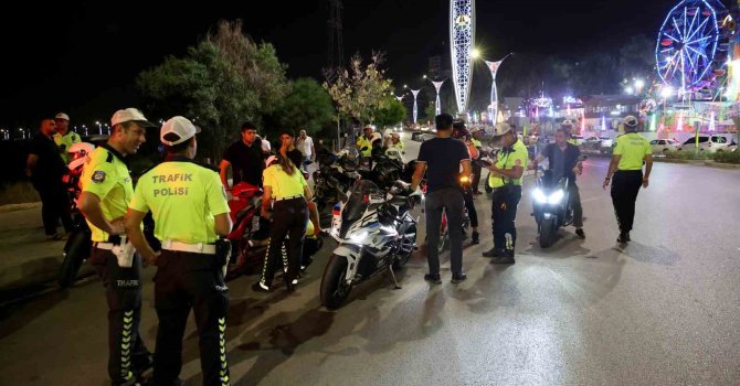 Trafik polisleri uygulama noktasında yaptığı kontrollerde, ehliyetsiz 42 sürücüye, kask takmayan 179 sürücüye, plakasız araç kullanan 14 sürücüye, motosikletinde abart egzoz olan 9 sürücüye ve diğer maddelerden olmak üzere toplamda 347 sürücüye cezai işlem uyguladı.