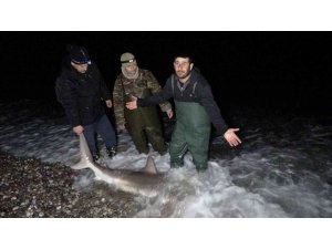 Antalya'nın Manavgat ilçesinde Alara Çayı'nın denize döküldüğü yerde balık tutan vatandaşların oltasına 2 metre boyunda yaklaşık 150 kilogram ağırlığında köpekbalığı takıldı. Dev bir kuzu balığı yakaladıkları umuduyla makinaya sarılan balıkçılar, gördükleri manzara karşısında şaşkına döndü.