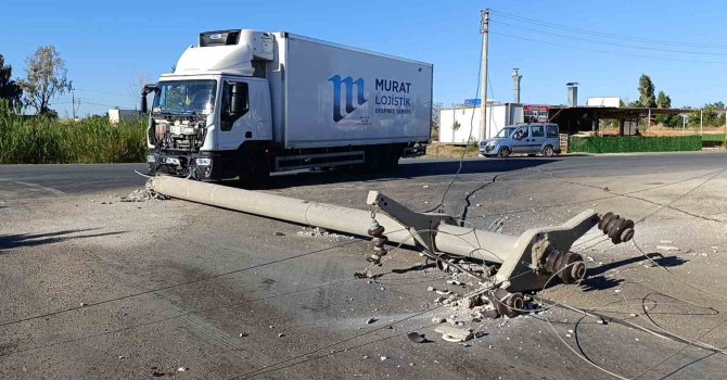 Antalya'da lojistik kamyonunun çarptığı yol ortasındaki beton elektrik direği yıkılırken kamyon sürücüsü yaralandı.