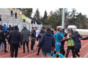 Maküspor taraftarları maç boyu Didimspor oyuncularına tepki gösterirken çıkan kavgayı gören bazı taraftarlar sahaya atlamaya çalıştı.