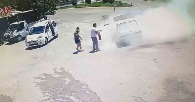 Antalya'nın Serik ilçesinde Tofaş marka otomobilde çıkan yangın esnasında aracın LPG'li olduğunu öğrenen esnaf, alevleri söndürmek için kullandığı yangın tüpleri boş çıkınca büyük panik yaşadı. Yaşananlar güvenlik kamerası tarafından anbean kaydedildi.