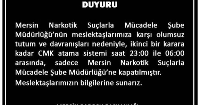 Baronun resmi sosyal medya hesabından yapılan açıklamada, "Mersin Narkotik Suçlarla Şube Müdürlüğünün meslaktaşlarımıza karşı olumsuz tutum ve davranışlar nedeniyle ikinci bir karara kadar CMK atama sistemi saat: 23.00 ile 06.00 arasında sadece Mersin Narkotik Suçlarla Mücadele Şube Müdürlüğü'ne kapatılmıştır. Meslektaşlarımızın bilgilerine sunarız" denildi.