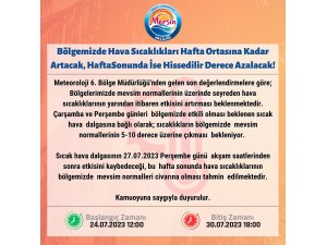 Mersin Valiliğinden yapılan açıklamaya göre, "Meteoroloji 6. Bölge Müdürlüğünden gelen son değerlendirmelere göre, bölgelerimizde mevsim normallerinin üzerinde seyreden hava sıcaklıklarının yarından itibaren etkisini artırması beklenmektedir. Çarşamba ve perşembe günleri bölgemizde etkili olması beklenen sıcak hava dalgasına bağlı olarak, sıcaklıkların bölgemizde mevsim normallerinin 5-10 derece üzerine çıkması bekleniyor. Sıcak hava dalgasının 27 Temmuz Perşembe günü akşam saatlerinden sonra etkisini kaybedeceği, bu hafta sonunda hava sıcaklıklarının bölgemizde mevsim normalleri civarında olması tahmin edilmektedir. Sıcak hava dalgası nedeniyle, bölgemizde yaşayan kronik rahatsızlığı olanlar, yaşlılarımız ve çocuklarımız başta olmak üzere vatandaşlarımızın günün en sıcak saatleri olan 11.00 ile 16.00 saatleri arasında dikkatli ve tedbirli olmaları gerekmektedir" ifadelerine yer verildi.