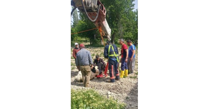 Titiz bir çalışmanın ardından iş makinesine halat yardımıyla bağlanan dana kuyudan çıkarılarak sahibine teslim edildi.