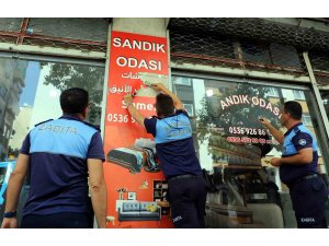 Mersin'in merkez ilçe Akdeniz Belediyesi Zabıta Müdürlüğü ekipleri, ilçe sınırlarında yaptığı denetim ve kontrollerde, onlarca işyerinin cam veya duvarlarına asılan Arapça tabelaları, flama ve farklı reklam materyallerini kaldırdı.