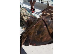 Mersin'in Aydıncık ilçesi açıklarında balıkçılar 200'şer kiloluk 2 vatoz balığı yakaladı.