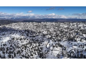 Mersin Anamur ilçesinde yüksek rakımlarda ormanlar karla kaplandı, bölge dronla havadan görüntülenirken ortaya kartpostallık görseller çıktı.
