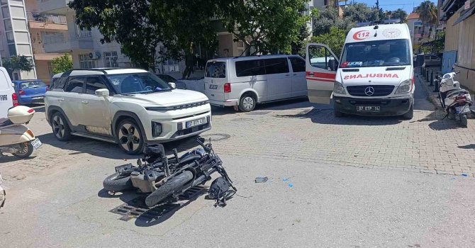 Antalya'nın Manavgat ilçesinde motosikletin otomobile yandan çarpması sonucu meydana gelen kazada motosiklet sürücüsü yaralandı. Kaza anları güvenlik kamerasına yansıdı.
