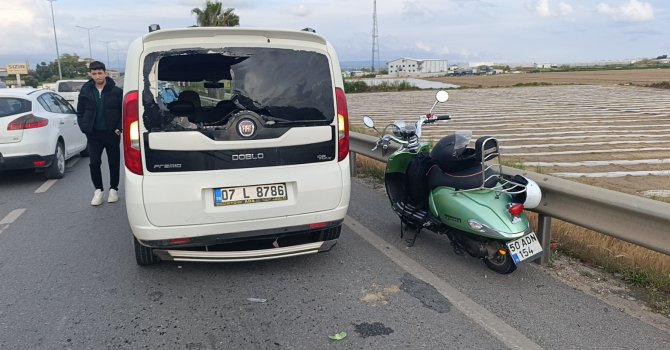 Antalya'nın Manavgat ilçesinde motosikletin hafif ticari araca arkadan çarptığı kazada, çarpmanın etkisiyle aracın arka camından içeri giren motosiklet sürücüsü, başındaki kask sayesinde ölümden döndü.