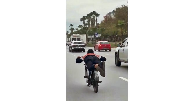 Antalya'da motosikleti yüzüstü yatarak kullanan kasksız sürücü, hem kendi hem de diğer sürücülerin hayatını tehlikeye attı. Diğer sürücüler tarafından cep telefonu kamerasıyla kaydedilip sosyal medyada paylaşılan görüntüler tepki çekti.