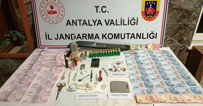 Antalya İl Jandarma Komutanlığı KOM Şube Müdürlüğü tarafından, Kepez İlçesinde E.T. ve A.B. isimli şahısların motosiklet ile dağıtım uyuşturucu madde sattıklarının tespit edildi. Antalya Cumhuriyet Başsavcılığı talimatları doğrultusunda, KOM Şube Müdürlüğü ve Kepez İlçe Jandarma Komutanlığı ekipleri, şüphelileri Yeni Emek mahallesinde durdurarak yakaladı. Şüphelilerin üst, araç ve ikametlerinde yapılan aramalarda 97 gram metamfetamin, 10 gram kubar esrar, hassas terazi, pompalı av tüfeği, suçtan elde edildiği değerlendirilen 12 bin TL gelir, 7 uyuşturucu kullanma aparatı ele geçirildi.