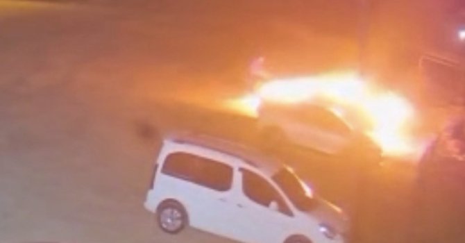 Olay anı ise saniye saniye güvenlik kamerasına yansıdı. Görüntülerde, kafasında kask bulunan motosikletli bir şahsın gelerek, yanıcı maddeyi aracın üzerine döktüğü ve ateşe verdiği anlar yer aldı.