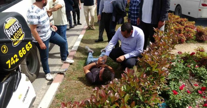 Antalya'nın Manavgat ilçesinde sipariş dönüşündeki motosikletli kurye, otel servisi ile refüj arasında sıkıştı. Yaralanan kuryenin yardımına, caddede seçim çalışması yapan AK Parti ekibi koştu.